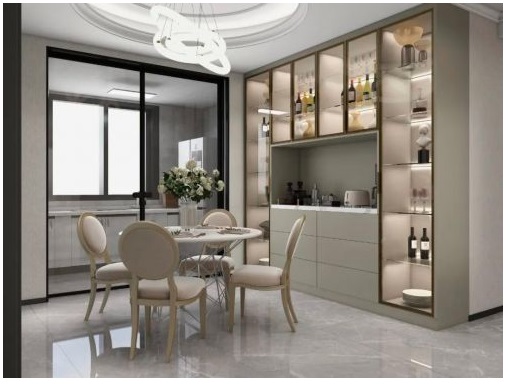餐邊柜除了滿足收納,也起到重要的裝飾作用。由上至下的玻璃材質柜門,為空間增加通透性,柜內擺上喜歡的酒、杯子等,盡顯生活格調,中間留空設計,便于放置水壺、香氛等小物件,維持臺面整潔,營造一個舒適的用餐環境。
