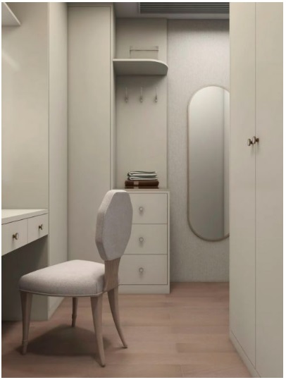 環保材質飾面、珍珠白色的涂裝自帶高級感,從收納到展示,再到梳妝臺的設計,簡約的造型把握著細膩的空間視覺,柔和而不失精致。