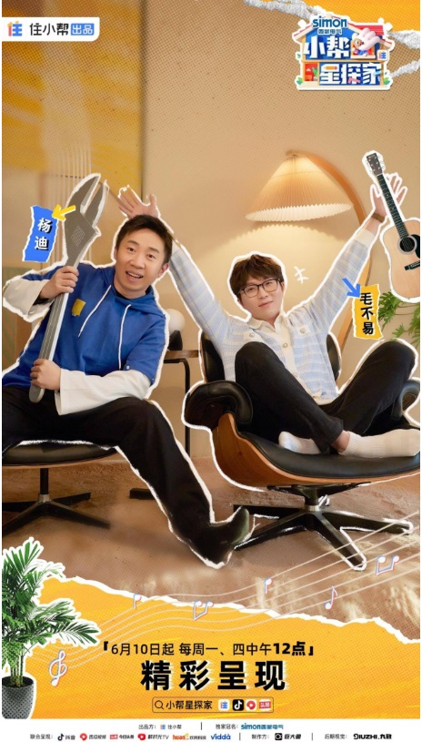 6月10日,首檔明星居家社交微綜藝《小幫星探家》上線。該節目由真實可靠的一站式家裝家居服務平臺住小幫出品,陣容集結幽默主持人楊迪、“跨界社恐歌手”毛不易、金句女王傅首爾、星星女神陳妍希、居住領域專家逯薇老師多位嘉賓。