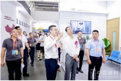 6月20日,海開控股集團(tuán)黨委副書記、總經(jīng)理馬光華,副總經(jīng)理付洪嶺,總經(jīng)理助理、成本控制中心總監(jiān)湯曉燕等相關(guān)領(lǐng)導(dǎo)來到中晶建材集團(tuán)展臺,仔細(xì)傾聽相關(guān)人員的介紹和講解,詳細(xì)了解產(chǎn)品性能,并對中晶板材的場景應(yīng)用和技術(shù)創(chuàng)新進(jìn)行交流。