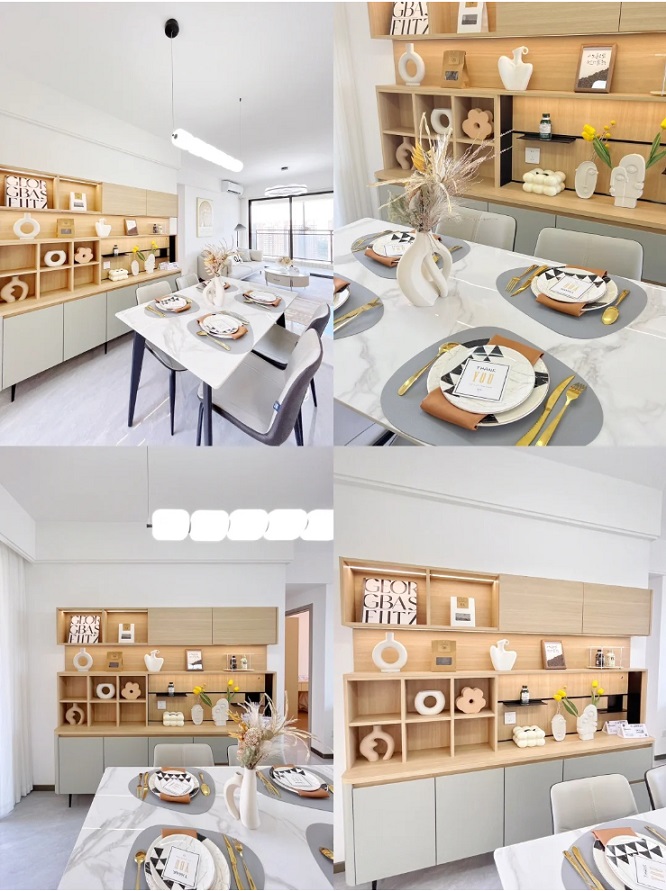 這款餐邊柜采用了開放式的設計,不同于傳統的一門到頂柜。業主熱愛精致小巧的裝飾品,追求溫馨舒適的家居氛圍,因此設計師精心選擇了奶油風搭配原木元素,為餐廳營造出柔和而溫暖的感覺。墻邊的收納柜配色上采用了淺淡的原木色和霧霾藍的組合,讓人一眼就能感受到一種自然寧靜的舒適感。