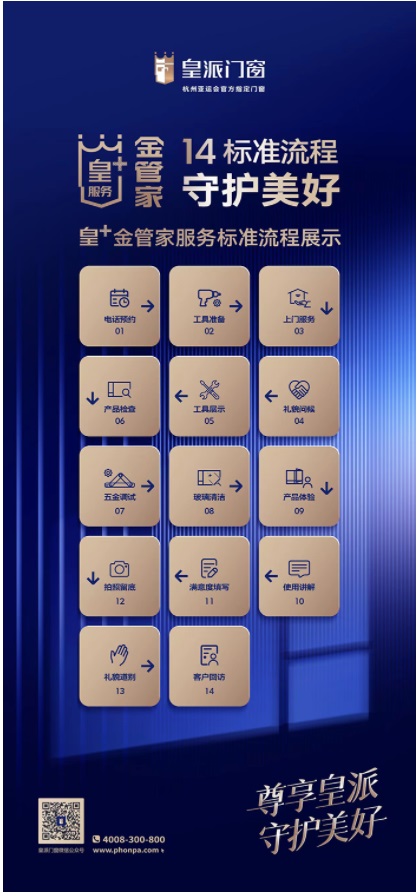 在金管家服務標準流程中,皇派門窗細致梳理出包含14個專業服務步驟的標準流程,包含但不限于深度除塵、玻璃清潔、潤滑維護、五金測試、檢查維修等全套門窗維保服務,將服務動作系統化為服務場景,構建了從客戶預約到上門提供服務,再到客戶回訪的服務閉環,全面守護客戶更美好的生活需求。