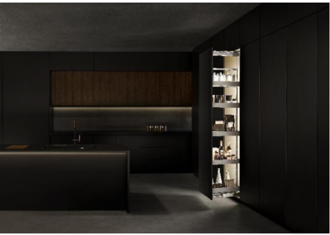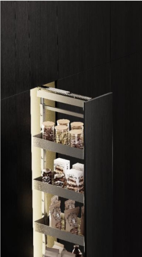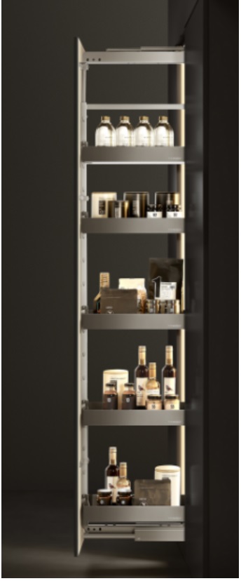 收零為整,納繁為簡,收納不止于技巧。一提及收納,許多人便會陷入空間貧瘠的迷陣,事實上空間不足只是假象,關鍵在于合理規劃與高效利用,冰箱側、玄關旁那些以往認為雞肋的角落蘊藏著巨大的收納潛能。悍高希勒高伸拉籃為零碎收納開辟了新的思路。拉籃籃體寬度最窄僅有250mm,最寬至350mm,可靈活嵌入各種邊邊角角,在看似無足輕重的角落拓出了收納空間。4~6層自選層數適配于不同高度柜體,不管是大戶型還是小戶型,都能擁有“擴容自由”。拉籃層高可自由手動調節,酒水零食、高瓶矮具、各類雜貨皆能有序歸位,各得其所,兌現本就精巧的碎片空間的每一寸空間價值。