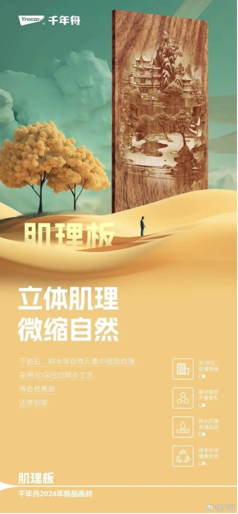 冬去春來,萬物復蘇,世間一切又迎來了嶄新且美好的一年——龍瑞呈祥2024。作為板材行業的領軍者,千年舟率先推出了一系列新品板材,其中千年舟肌理板便是一款極具代表性的高端新型飾面板,它是高端品質生活的象征,是自然與和諧的共生,更是健康家居的不二之選。