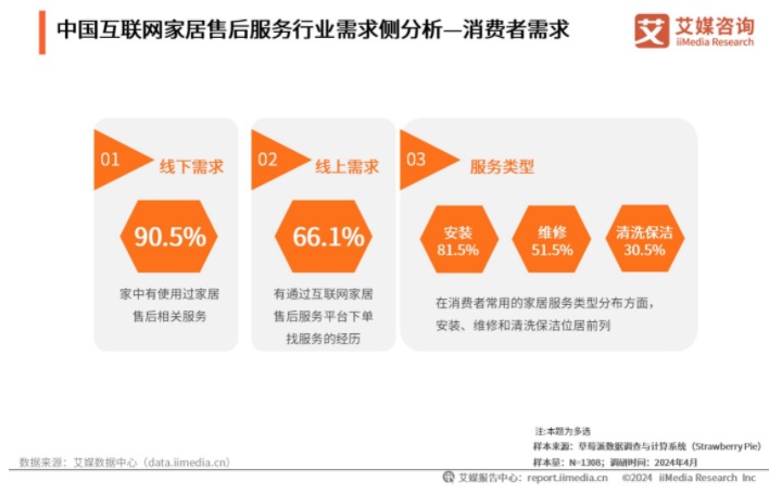 iiMedia Research(艾媒咨詢)調(diào)研數(shù)據(jù)顯示,隨著家居消費的增長,配套售后服務(wù)需求旺盛,用戶群體對家居售后相關(guān)服務(wù)的使用率極高,通過互聯(lián)網(wǎng)家居售后服務(wù)平臺下單尋求服務(wù)的用戶超6成(66.1%)。從消費者使用的家居售后服務(wù)類型分布來看,安裝服務(wù)以81.5%的比例占據(jù)首位,其次是維修(51.5%)和清洗保潔(30.5%)。