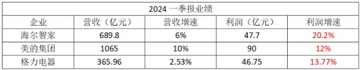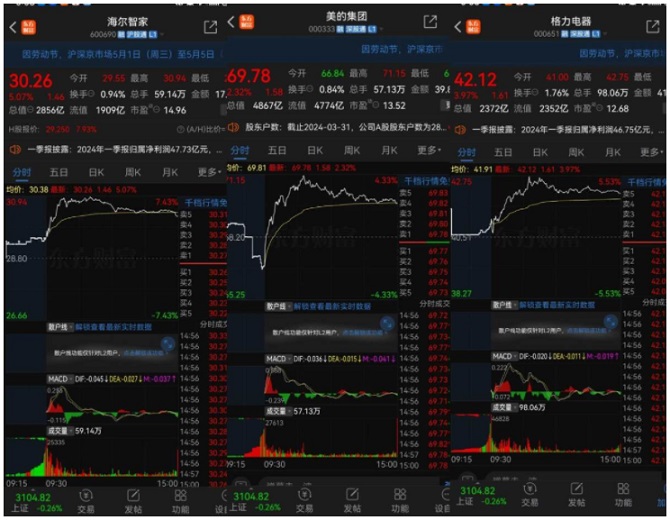 4月29日晚間海爾智家、美的集團、格力電器相繼公布了2024一季報。三家企業(yè)出色的業(yè)績表現(xiàn),帶動整體家電股板塊大漲。截至4月30日收盤,海爾智家漲幅5.07%、美的集團漲幅2.32%、格力電器的漲幅為3.97%。