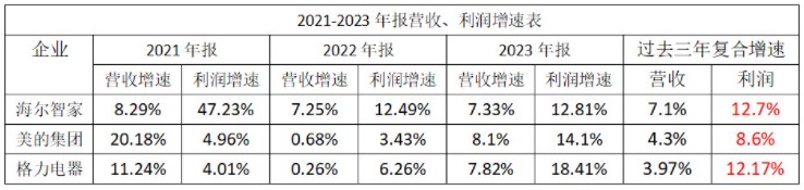 從圖表中的數(shù)據(jù)可以看到,三家企業(yè)2023年凈利潤增速都超過2位數(shù)。其中,海爾智家2021年的利潤增速是47.23%,2022年是12.49%,2023年是12.81%。從這三個數(shù)據(jù)看到,海爾智家的增長最為穩(wěn)健。