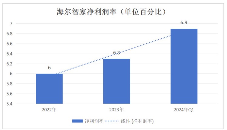 一直以來,三巨頭中,海爾智家費率和凈利率都是投資者關(guān)注的焦點。第一季度利潤增速超過20%,那么他的凈利率表現(xiàn)如何?為此,筆者專門查閱了2022年、2023年以及2024年第一季度的凈利潤率情況,具體數(shù)據(jù)如下:
