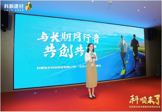 科順民建集團(tuán)品牌部袁春燕進(jìn)行了題為“與長(zhǎng)期同行者共創(chuàng)共享”的主題演講,深度挖掘并詮釋科順品牌的深厚底蘊(yùn)與魅力所在,充分展現(xiàn)品牌之美。她同時(shí)指出,公司將全面加大品牌推廣與建設(shè)力度,以更強(qiáng)大的品牌勢(shì)能賦能終端。