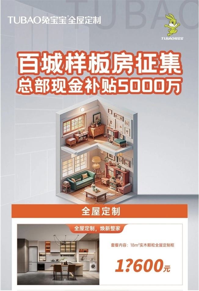 9月8日到10月20日,兔寶寶全屋定制向全國用戶征集樣板間,并給予總部現金5000萬補貼福利。