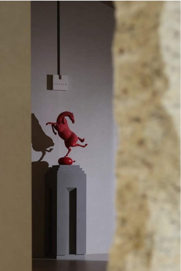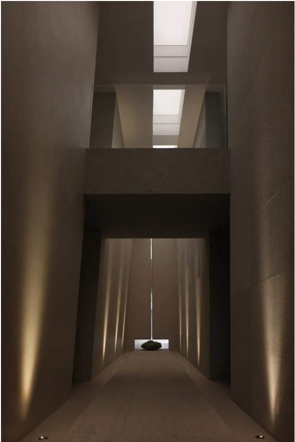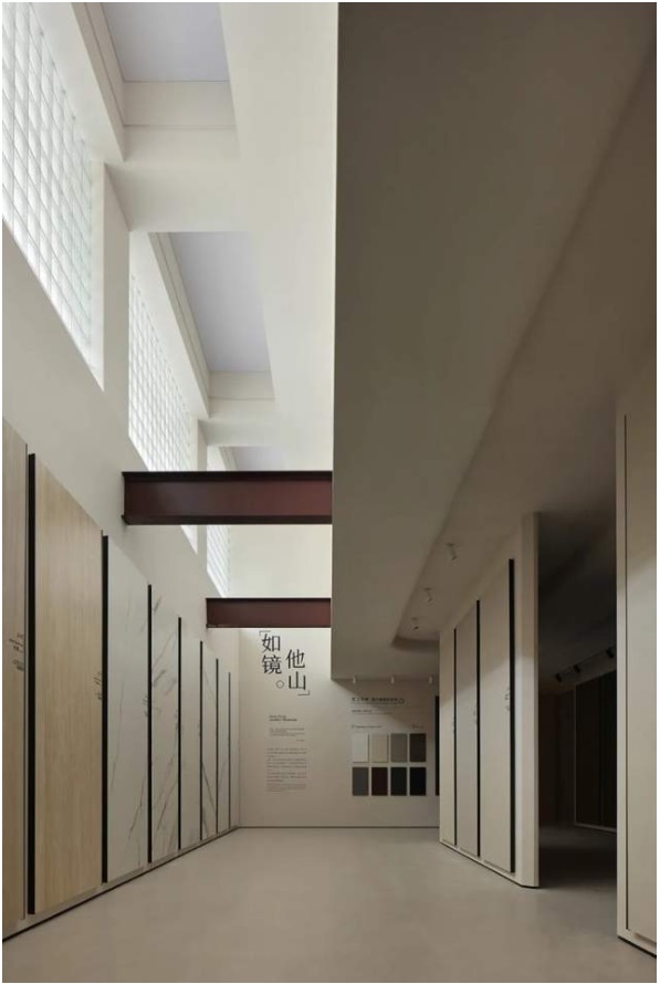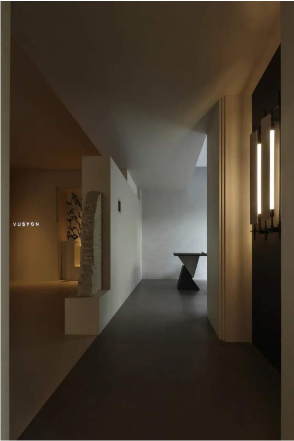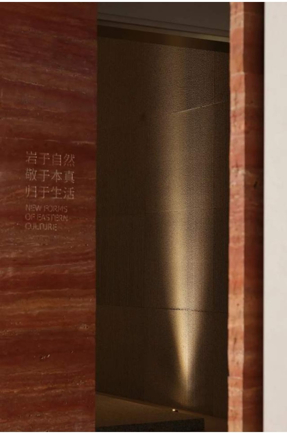 入目左側(cè)墻體采用巖板材質(zhì)由下往上傾斜,右側(cè)則采用大理石進(jìn)行拉槽處理,兩兩對(duì)望,巖板微傾,暗含巖板向大理石致敬之意。同時(shí),借助層高7米的原生建筑優(yōu)勢(shì)塑造了靜謐而深遠(yuǎn)的峽谷意象,建筑頂部引入天光,令立面墻體變得更加柔和有度。空間上則是呈現(xiàn)多維度多層次的博物館場(chǎng)景體驗(yàn),通過燈光變換,引導(dǎo)訪客順光而行,進(jìn)而開啟光的序幕。