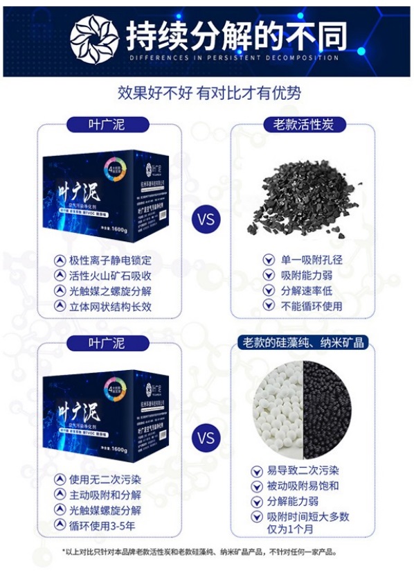 葉廣泥和活性炭不一樣,活性炭只能吸附,用一段時間以后吸附會飽和,葉廣泥不僅僅是吸附,是吸附后可以分解有害物質,不會再釋放,不需要暴曬,可以持久分解,使用3年。