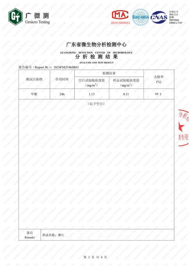 睿石是一種天然礦石,呈不規則形狀。睿石經特殊工藝活化后會生成豐富的孔隙,具有發達的孔隙結構、超大的比表面積。實驗室數據表明,睿石的比表面積是活性炭的幾十倍,且內部孔隙與甲醛分子大小相仿,所以睿石具備吸附甲醛等污染物的功效,能起到高效凈化空氣的作用。