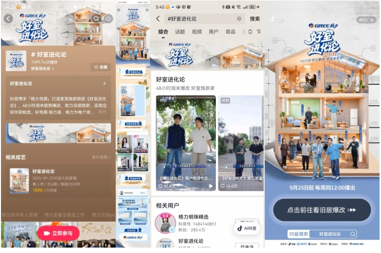 為打通 “觀看—種草—消費(fèi)” 的關(guān)鍵鏈路,「好室進(jìn)化論」IP特別打造H5專題頁面,最大化承接全站熱度,將內(nèi)容價(jià)值高效轉(zhuǎn)化為商業(yè)價(jià)值。專題頁作為微綜播放入口,支持用戶隨時(shí)回看節(jié)目精彩片段;同時(shí)整合達(dá)人種草專區(qū),集中展示格力產(chǎn)品在真實(shí)場景中的使用效果;最后設(shè)置 “同款選購” 通道,用戶可直接跳轉(zhuǎn)購買微綜中出現(xiàn)的新國標(biāo)全能王空調(diào)、505荔枝冰箱、鯨濤鋅礦凈水機(jī)等產(chǎn)品。另外,節(jié)目依托抖音平臺強(qiáng)大的流量資源,通過話題頁、開屏廣告、阿拉丁推薦、H5等多渠道全方位導(dǎo)流,最大化覆蓋目標(biāo)受眾。
