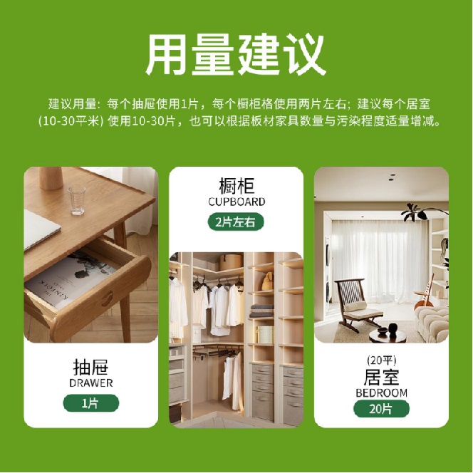 用法用量:希泰晶活性錳一袋20片,適合20平米新房或者一輛新車使用。主要放置在衣柜,櫥柜,書柜,客廳茶幾,床頭柜,梳妝臺等抽屜使用。一個抽屜放置1-2片,一個衣柜格子放置2-3片,一個房間使用20片。根據(jù)自己家里情況直接橫放或者豎貼都可以。