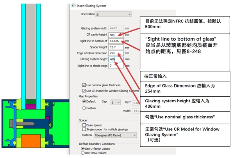 1. 正常設定所有玻璃系統參數,Spacer Height(間隔條高度)應與廠商實際產品的封邊高度一致。