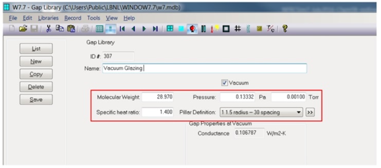 3. 選中Vacuum(真空)后,將出現一個新的頁面,需要用戶自定義一些參數,包括根據真空玻璃產品廠商提供的信息,填入如名稱、壓力、支撐柱的定義(支撐柱名稱、半徑和間距)等數據。熱導率將根據用戶輸入自動調整。分子量(28.970)和比熱比(1.4)作為默認值不得更改。壓力只需輸入一個壓力單位,Pa、psi 或 Torr,WINDOW 將自動轉換其它壓力值。