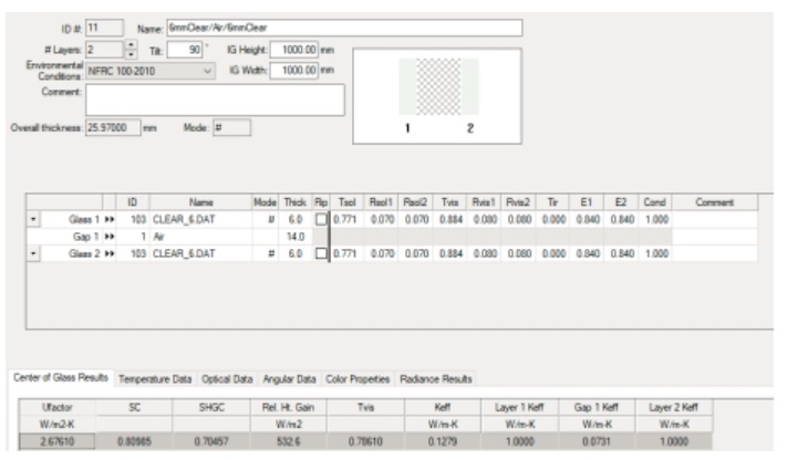 首先需要創建兩個不同的COG系統:一個僅包含玻璃(無層間板構件),另一個包含了玻璃和層間板構件(層間板系統)。這是必需的,因為玻璃層將是唯一導入THERM的構件,建模師將添加層間板構件(金屬板、保溫材料和適當的空腔)作為與玻璃相鄰的多邊形圖塊,從WINDOW中計算得到層間板系統的COG值,并將其輸入面積加權電子表格。