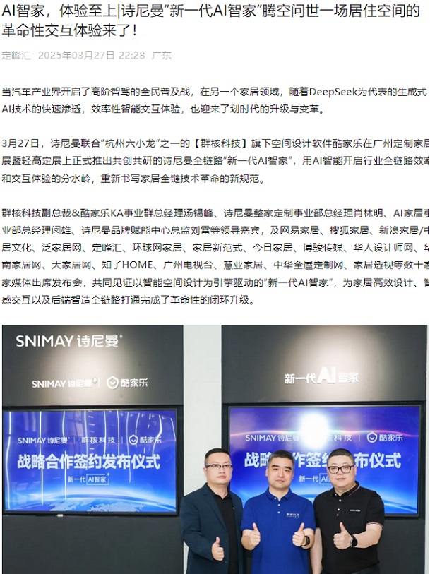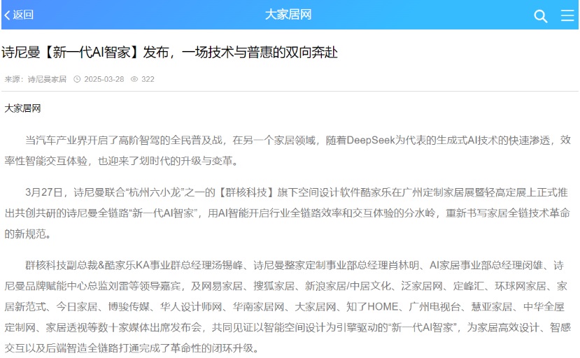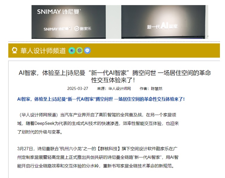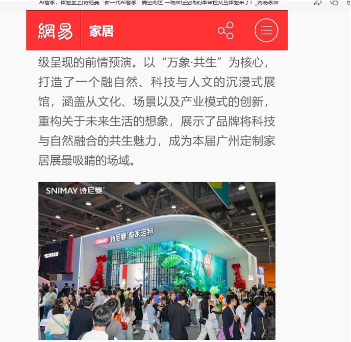 詩尼曼2025廣州定制展引發(fā)的“新一代AI智家”浪潮,吸引行業(yè)內(nèi)外50+頭部媒體深度剖析。行業(yè)媒體將展館定義為“現(xiàn)象級商業(yè)試驗場”,盛贊“日均5000客流重構(gòu)展會流量法則”,聚焦“50+N無界店態(tài)瓦解渠道邊界邏輯”,更以“攜手群核科技開啟AI智能平權(quán)”驗證詩尼曼家居劃時代升級與變革的實力。