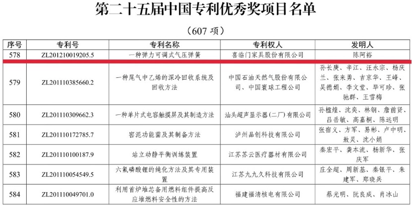 6月5日,國家知識產權局公布第二十五屆中國專利獎授獎決定,在本屆769項中國專利獎獲獎名單中,科技睡眠企業喜臨門(603008.SH)憑借“一種彈力可調式氣壓彈簧”(ZL201210019205.5)榮獲中國專利優秀獎。