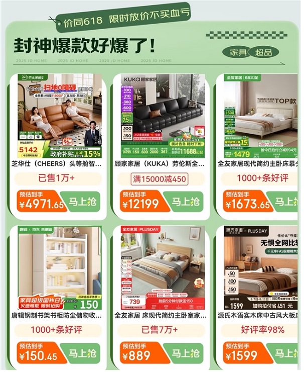 家,是人們工作一天后放松身心的港灣。在京東家具超級品類日的必買榜中,我們看到了90后消費者對家具的偏好:拒絕千篇一律的“標準化”,追求“懶人友好”的便捷性,渴望“像自己”一樣獨特的個性化。以封神爆款必買榜為例,喜臨門乳膠獨袋床墊白騎士plus,以其軟硬適度的舒適度,為用戶帶來睡眠的幸福感,治愈一天的疲累;芝華仕美拉德真皮功能沙發,不僅能坐能躺,還能享受愜意的下午茶時光;米家智能晾衣機1C,智能操作,手勢感應,抬手即升,讓晾衣變得輕松又便捷。這些爆款產品,無一不在為消費者打造一個舒適、便捷、個性化的家居空間。