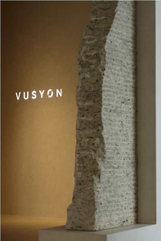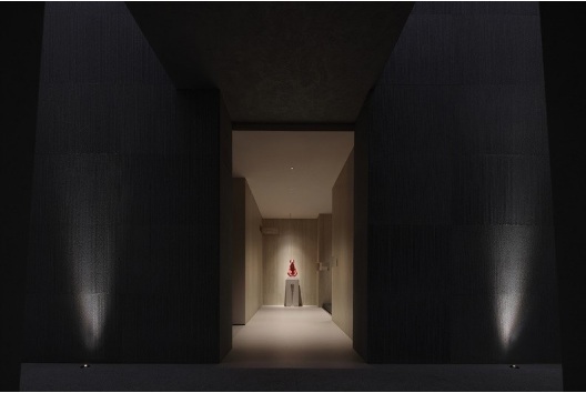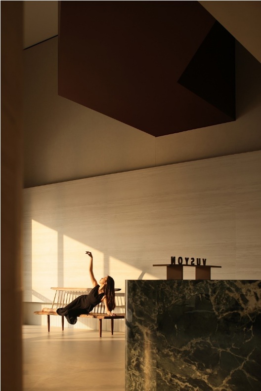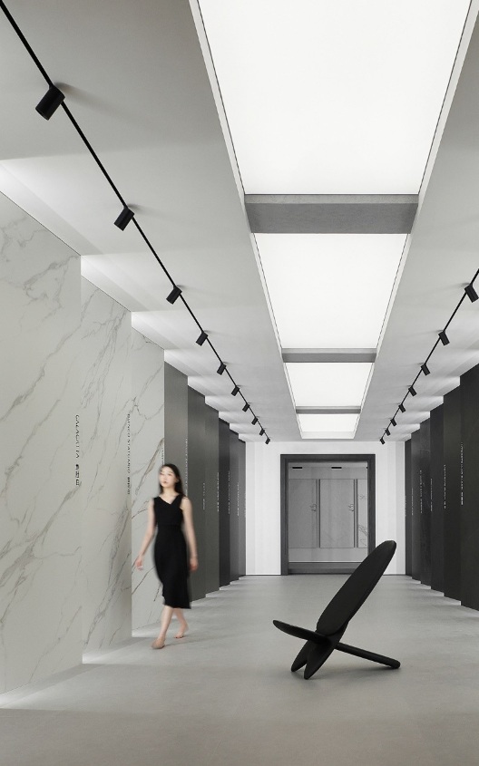 入口左側墻體由下往上傾斜,采用巖板材質,右側采用大理石拉槽處理,巖板向大理石致敬。借助層高7米的優勢塑造了靜謐而深遠的峽谷意向,頂部天光令立面變得柔和有度。空間呈現多維度的博物館場景體驗。兩邊材質通過燈光引導訪客順氣前行,進而開啟光的序幕。