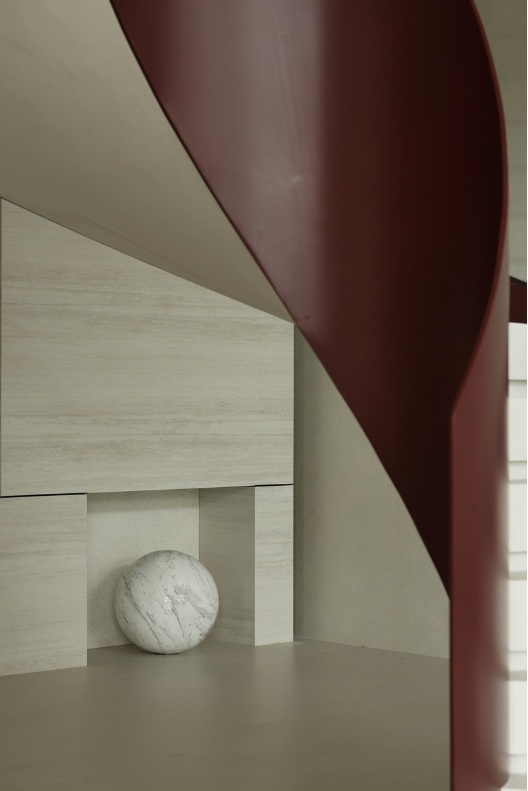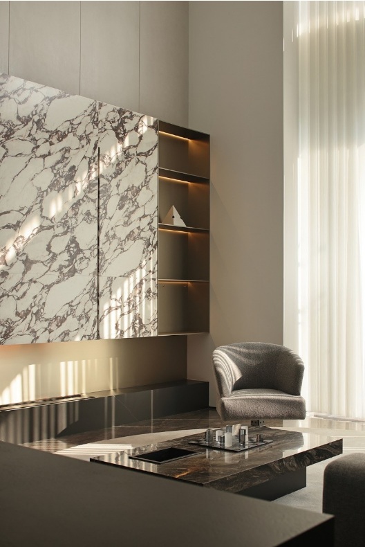大理石經過風雨過后留下的痕跡結合巖板融入空間,增添空間立體感和趣味性,呈現出多維度的場景。