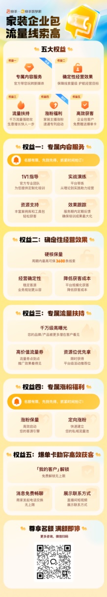 此次升級的企業季度包主要面向有線上內容獲客需求的家裝行業商家,如裝修公司、全屋定制、建材公司、家具公司等。該產品是快手筑夢家為家裝行業商家所定制的品效合一內容解決方案,旨在通過官方對家裝商家新媒體矩陣賬號的深度賦能指導,提升家裝企業的內容創作能力,同時搭配線索權益、專屬大額流量、專屬漲粉福利等資源,最終助力家裝企業通過新媒體內容進行線上穩定經營。升級后企業季度包將分別提供不同的扶持流量和經營資源,供商家個性化選擇。