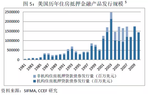 信用一再下沉導致房屋貸款發放機構的風險敞口不斷擴大,此時房貸金融化高度發達的市場在幫助放貸機構回籠流動性、轉移風險的過程中扮演了重要的角色。1970年代房地美和吉利美成立,其后20年內MBS和CMO的發行規模翻10倍有余,2001至2007年房地產泡沫時期美國住房抵押貸款債券總發行量最高擴大近一倍,其中非機構發行量年均增長68%。房貸金融化形成的風險轉移機制進一步刺激信貸機構肆無忌憚地貸款發放的門檻,擴大房貸的規模。