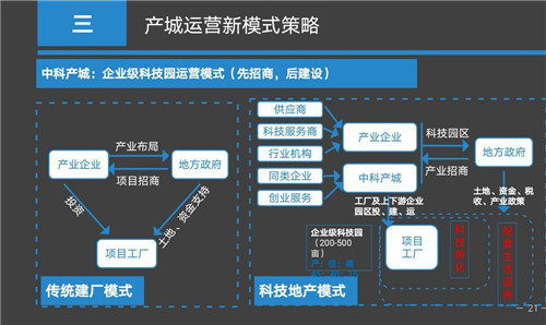 中科產(chǎn)城公司的客戶,一類是企業(yè)級客戶,一類是政府平臺類客戶。企業(yè)級客戶就是產(chǎn)業(yè)內(nèi)優(yōu)秀的大咖企業(yè),幫他們與地方政府洽談做企業(yè)級科技園,幫企業(yè)產(chǎn)業(yè)項(xiàng)目落地。同時圍繞企業(yè)的上下游產(chǎn)業(yè)鏈整合一個新的科技孵化器及科技園區(qū),在為這些工廠和孵化器的從業(yè)人員提供配套的公寓、住宅、商業(yè)等城市功能服務(wù)。