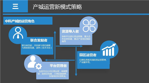 那么總體來講,中科產(chǎn)城公司作為產(chǎn)城開發(fā)與運(yùn)營的實(shí)踐者,我們將在產(chǎn)城項(xiàng)目全景運(yùn)營過程中發(fā)揮四個主要角色:一個聯(lián)合發(fā)起者,是作為項(xiàng)目的聯(lián)合發(fā)起者參與前期的策劃、規(guī)劃,與政府及各方就投資與商務(wù)條件達(dá)成共識。二是資源導(dǎo)入者,將投資資金、產(chǎn)業(yè)項(xiàng)目、土地資源、配套政策等重要資源協(xié)調(diào)、導(dǎo)入到投資平臺內(nèi)。三是平臺管理者,以委托運(yùn)營或者"小股操盤"的方式承接主要投資方的委托,負(fù)責(zé)投資平臺的日常開發(fā)、運(yùn)營事務(wù),為各方實(shí)現(xiàn)產(chǎn)城項(xiàng)目預(yù)期收益。四是園區(qū)運(yùn)營者,作為產(chǎn)業(yè)園區(qū)專業(yè)的全景運(yùn)營機(jī)構(gòu),可以受投資平臺的專項(xiàng)委托僅對產(chǎn)城項(xiàng)目中最具挑戰(zhàn)的產(chǎn)業(yè)園區(qū)部分進(jìn)行管理服務(wù)。